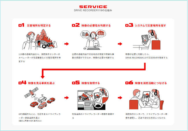 火災や交通事故等の緊急を要する災害現場において、119番通報だけでは状況が分かりにくい場合、現場付近を走行する車両のドラレコ映像をシステムで閲覧し、迅速かつ適切な消防部隊の投入や経路選定等消防活動に活用するもの。